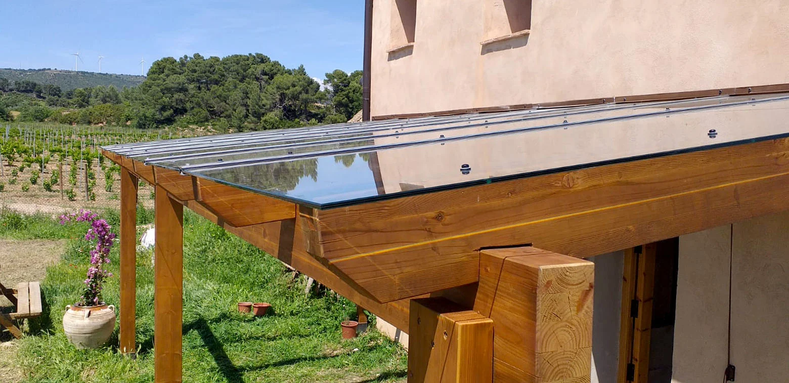 Pérgola con techo móvil de cristal y cerramiento acristalado en Valls