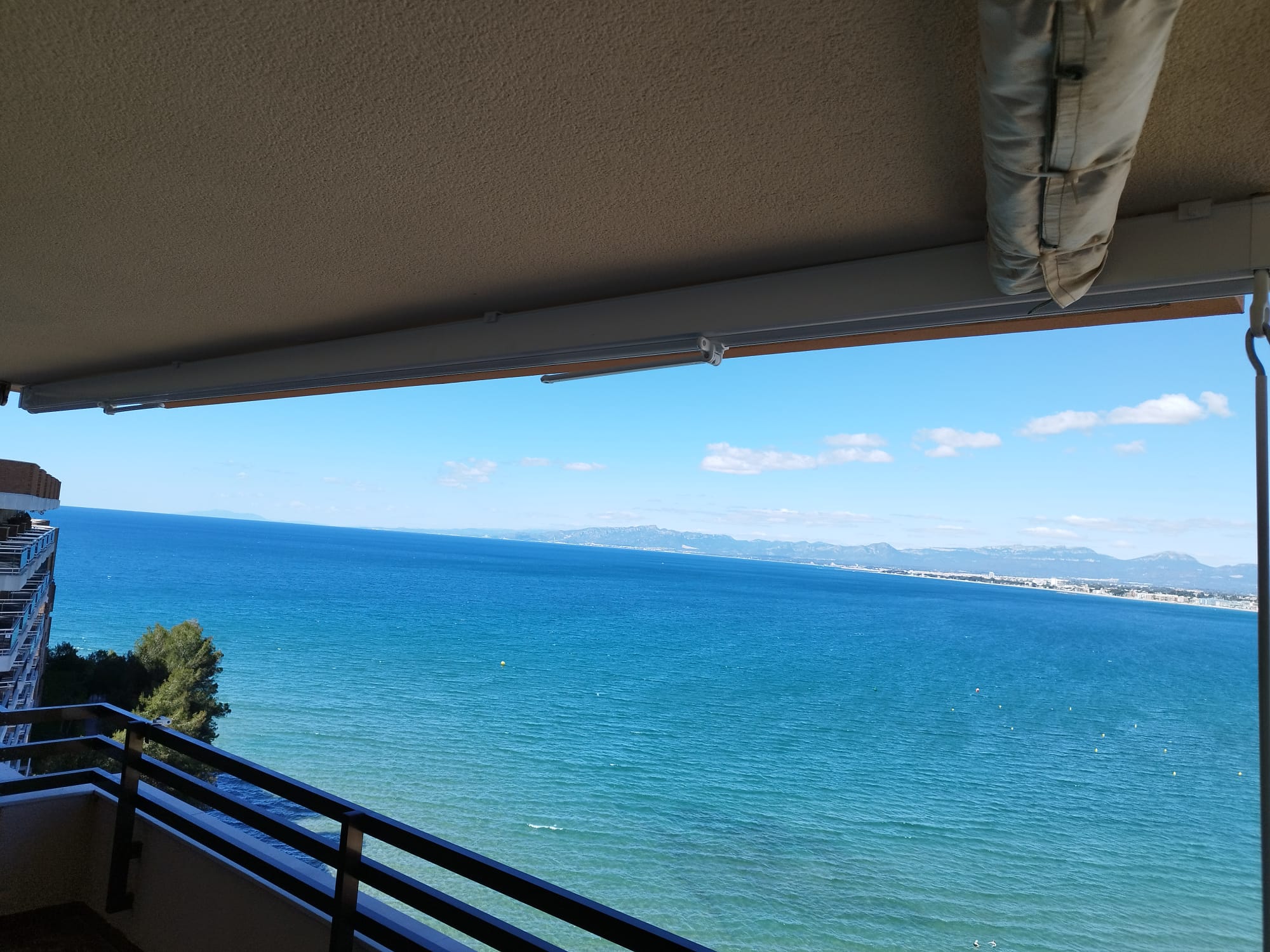 Salou. Instalación de toldo tipo stor de medidas 500×150 cm para apartamento frente a la playa con cofre desert para una mayor protección de la lona. Aluminio color blanco y lona Recasens color Mediterráneo.