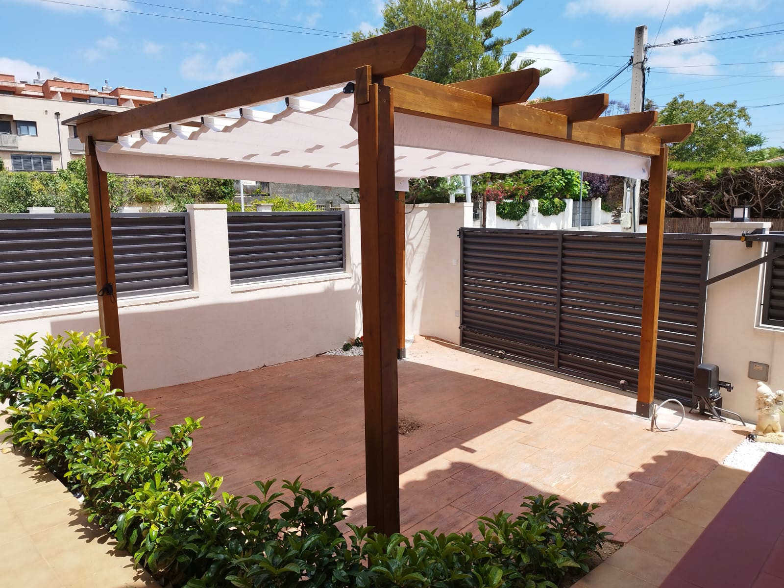 Pérgola de madera con Toldo Plano corredero en La Secuita