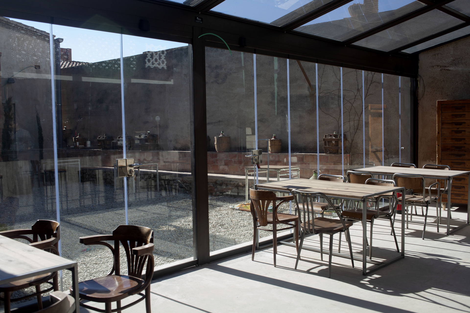 Valls. Instalación de pérgola de aluminio con techo de cristal totalmente automatizado y cerramiento acristalado a juego en aluminio marrón para restaurante de la zona.